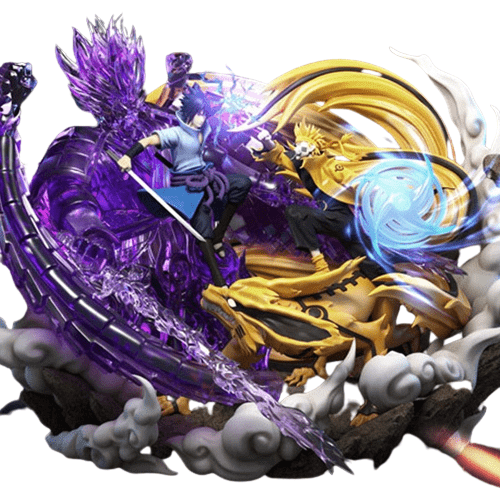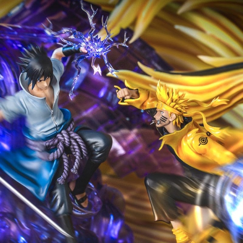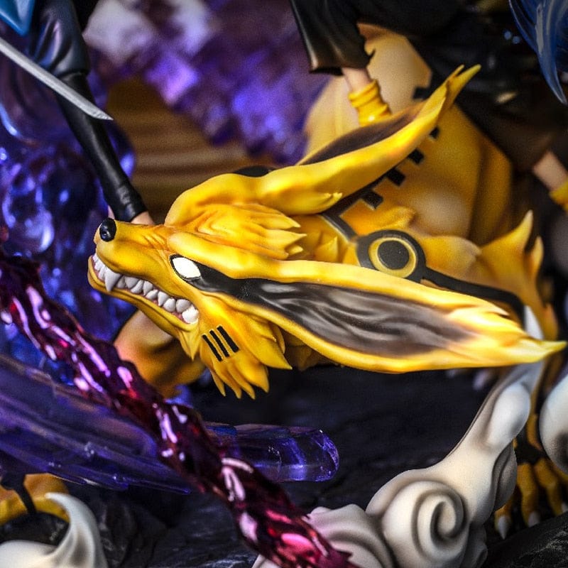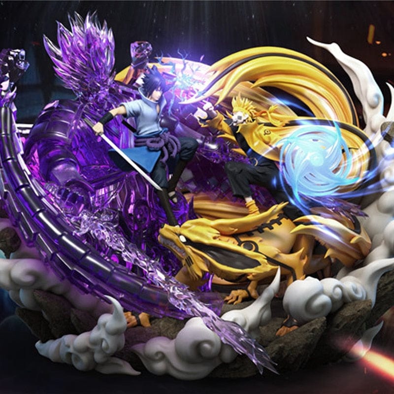 Notre figurine met en scènes les deux protagonistes du mangas face a face, Naruto accompagné du demon renard Kyubi, en train de pratiquer un Razengan. Sasuke est quant a lui accompagné de Susanoo, et est en train d'effectuer un Chidori.