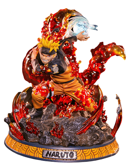La Figurine Collector en Résine Naruto Kyubi représente un Naruto enchevêtré dans son démon renard de couleur rouge orangée. Dans une de ses mains, le jeune ninja tient une orbe tourbillonnant lumineuse pour démontrer son contrôle extrêmement pointu du chakra. L'air sérieux, celui qui convoite tant la place de Hokage de son village est prêt au combat.