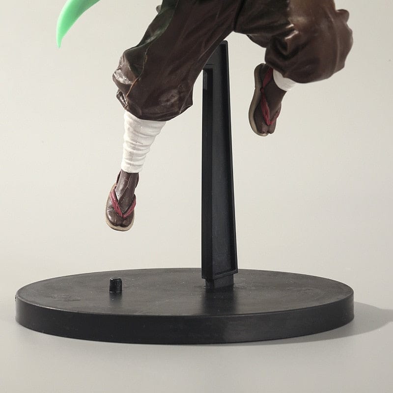 La Figurine Demon Slayer Tanjiro 12 cm représente Tanjiro Kamado en plein élan pour pourfendre un démon. Il est tenu en lévitation par un socle en plastique noir. Le jeune héros porte son costume noir et par dessus son manteau carrelés, noir et vert mousse. Il brandit son épée à lame noire, l'air furieux. Tanjiro a les cheveux noirs hérissés sur sa tête et porte ses boucles d'oreille hanafuda. Son visage porte la cicatrice d'une veille brûlure.