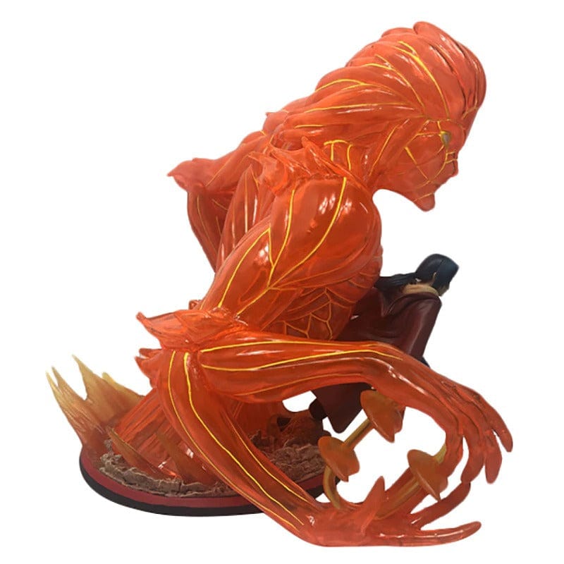 La Figurine Itachi Susanoo Edo Tensei représente le personnage dans son élan, son chakra derrière lui, majestueux et imposant dans une couleur orange vive. L'entité apparaît sous une forme avancée puisqu'on voit son squelette à partir du buste. Le tronc, les bras et la tête sont bien distinctes. Comme toute créature ramenée à la vie par l'Edo Sensei, les yeux d'Itachi sont noirs et menaçants. Tu reconnaîtras bien le personnage avec son air sévère habituel et son manteau brun.