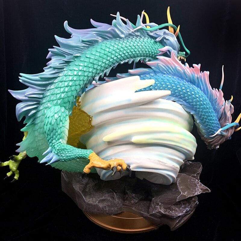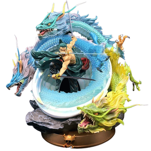Figurine Zoro Tornade, représentée sur cette figurine, en posture de combat, ses lames dans chaque main et un sabre entre les dents, une technique qu’il affectionne tout particulièrement et qu’il a appris à perfectionner avec le temps. Avec deux dragons, vert et bleu autour de lui, qui donne un effet de vague et de tornade bleu-vert. On ne lit que la détermination dans ses yeux. Comme dans chaque combat, Zoro est concentré sur son adversaire et sans peur.